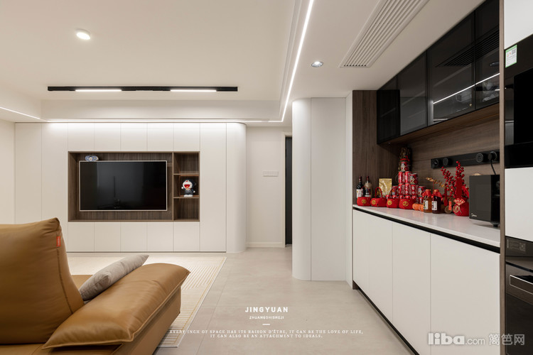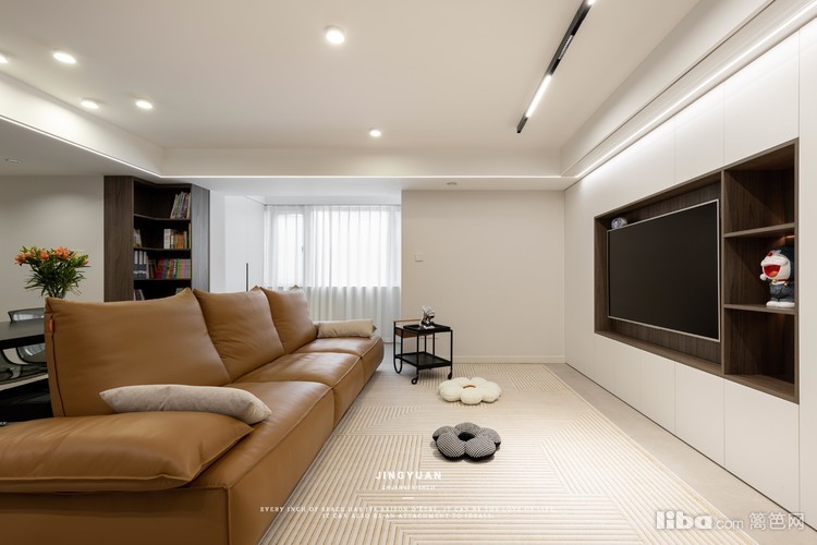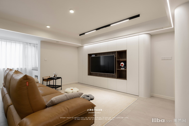 电视背景墙做了整墙定制柜,造型简单大气。圆弧的边角设计,照顾到家里的小朋友,减少磕碰机率。