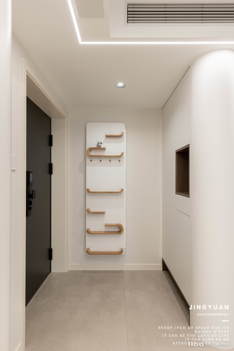 入户区域,新建轻体隔墙重新规划玄关。利用同样的圆弧设计做墙体,连接定制鞋柜,设计出一小处门厅区域