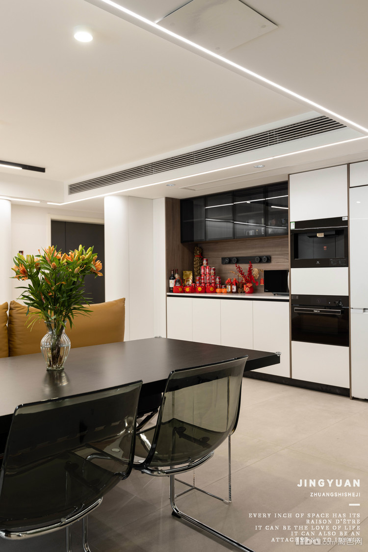 客餐厅一体设计的另一处亮点就是玄关墙背后的这一组餐边柜。位置上兼顾厨房和用餐区,使用非常便利。