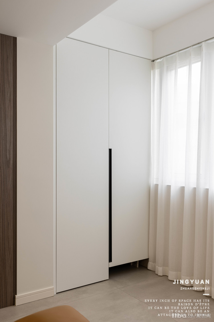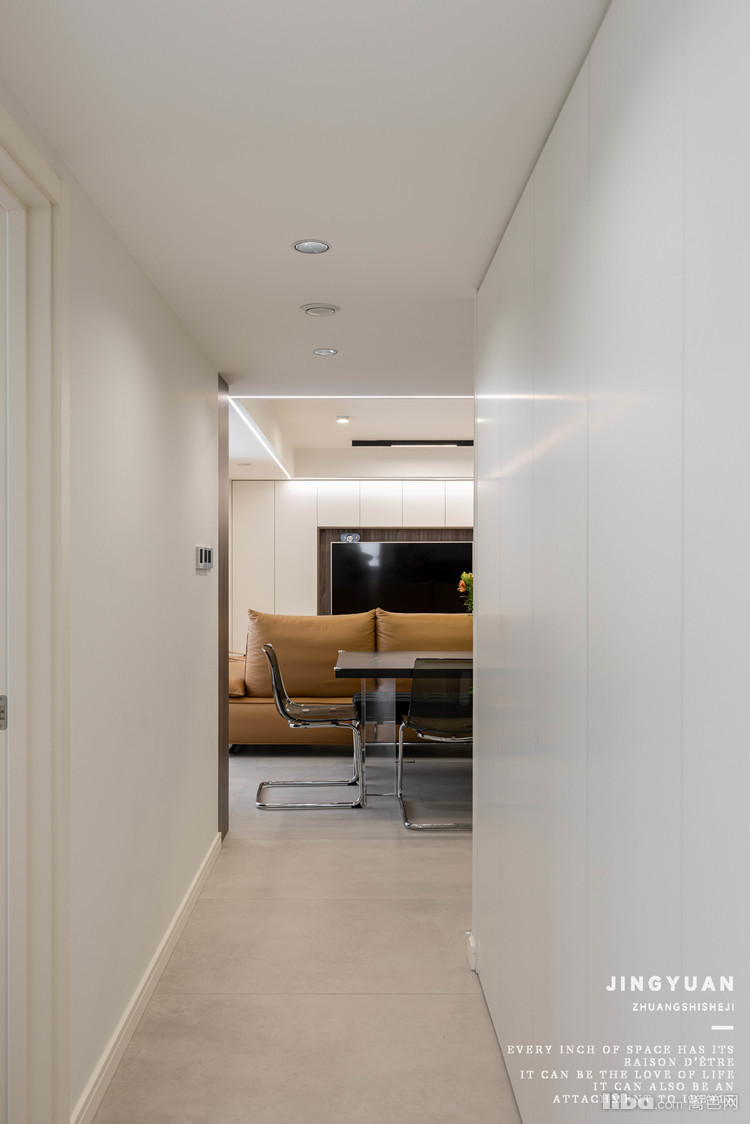地面通铺淡灰色大板瓷砖,墙顶做同样白色乳胶漆,大面积浅色,视觉膨胀空间感。