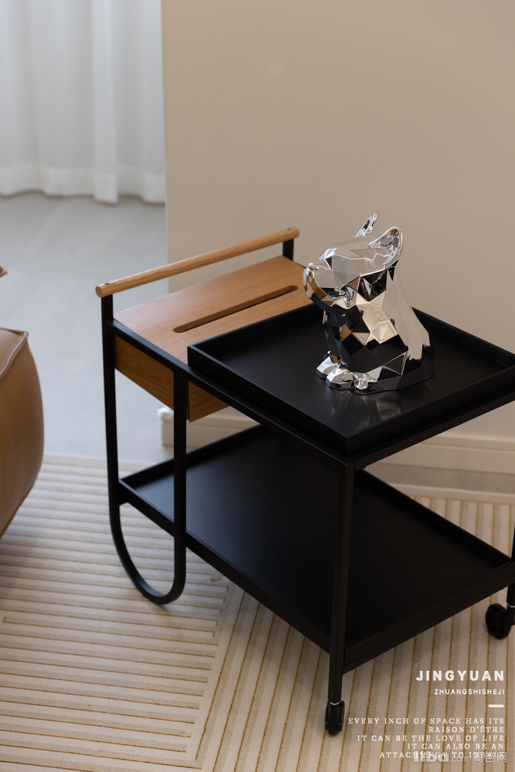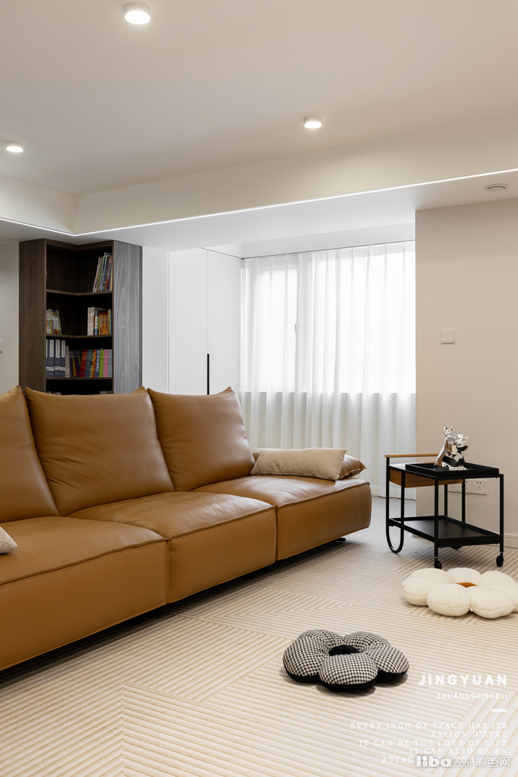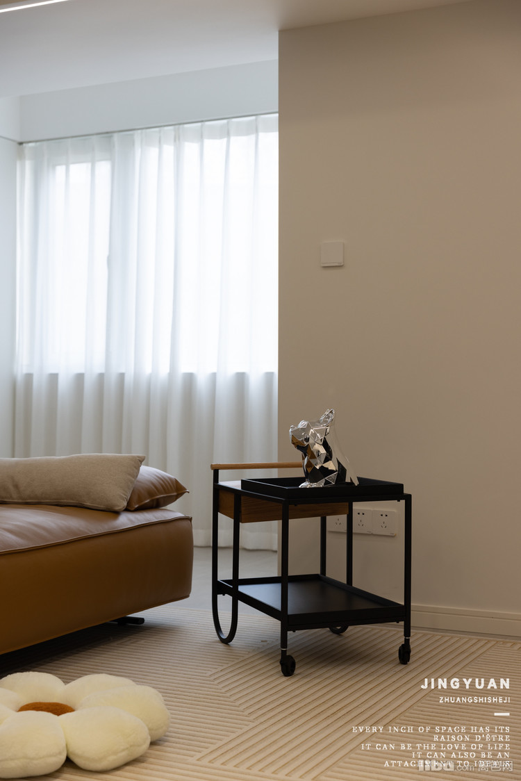 不做茶几,而是选用可移动边几,弱化家具拥挤感。过道充足的情况下,客厅还能放下大件钢琴。