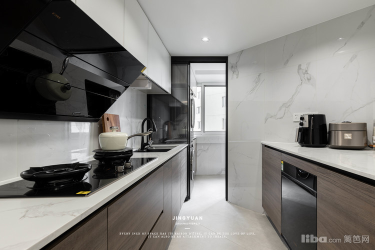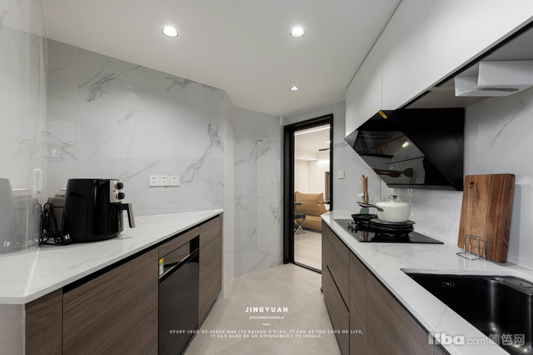 但为了提高厨房的通透性,让厨房空间不压抑,设计师选用极窄半透玻璃门,内外联动更明显。