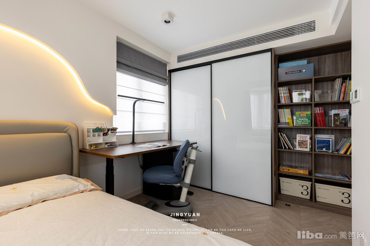 儿童房的设计主要以满足小朋友学习和储物为主。宽大的书桌写字台连接床头空间,还能兼顾床头柜的放置功能。