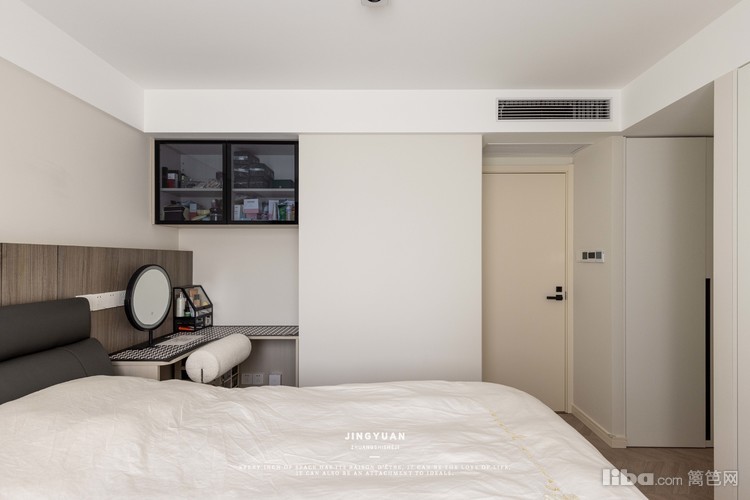床头宽度有限,不做传统的床头柜设计,而是定制吊柜+转角梳妆台,满足女业主日常使用功能即可。