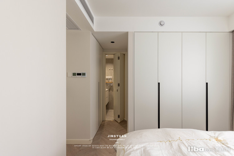 床尾空间定制的整墙衣柜,能放下四季衣物。借用厨房的一点空间,满足主卧独立卫生间的需求。
