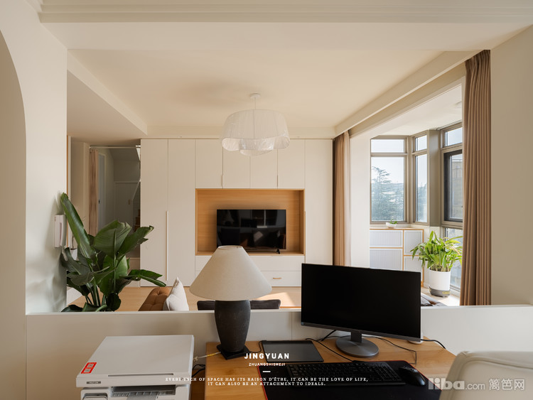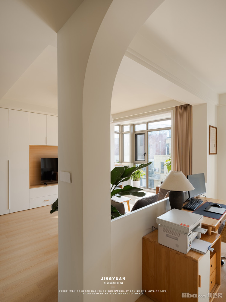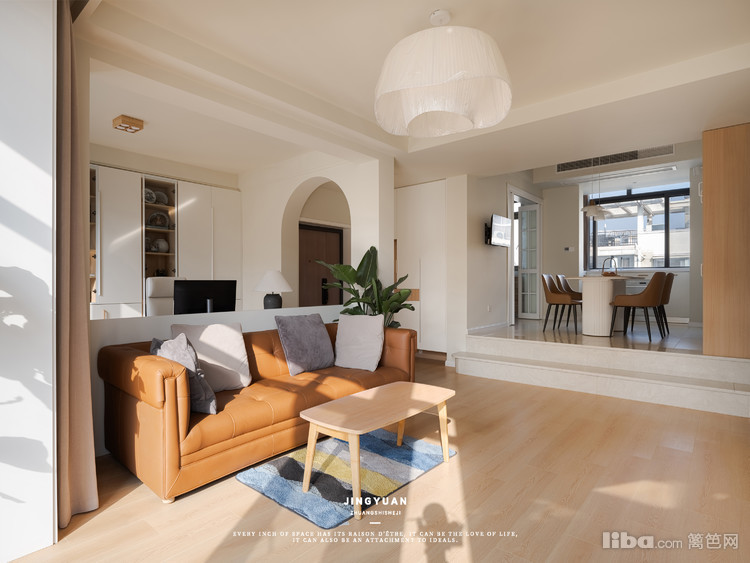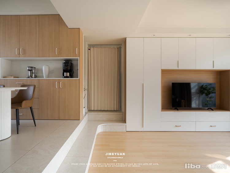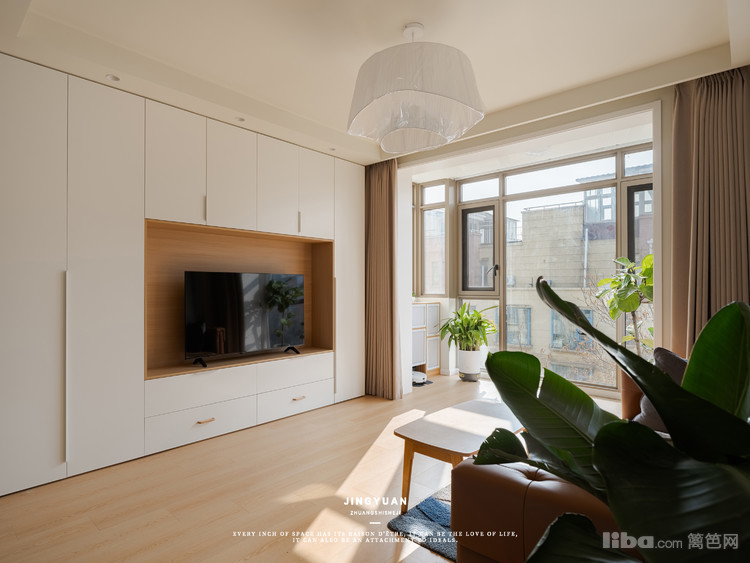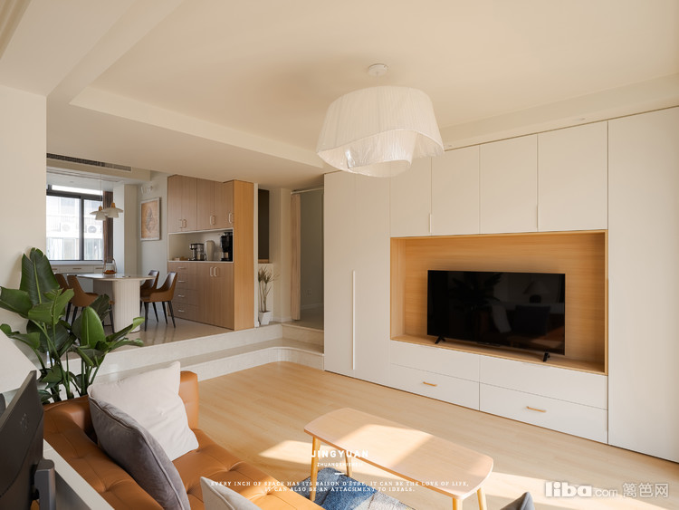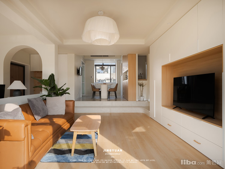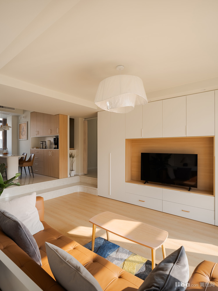 地板、茶几以及各种柜子都以原木和白色为主,视觉通透又充满温馨!