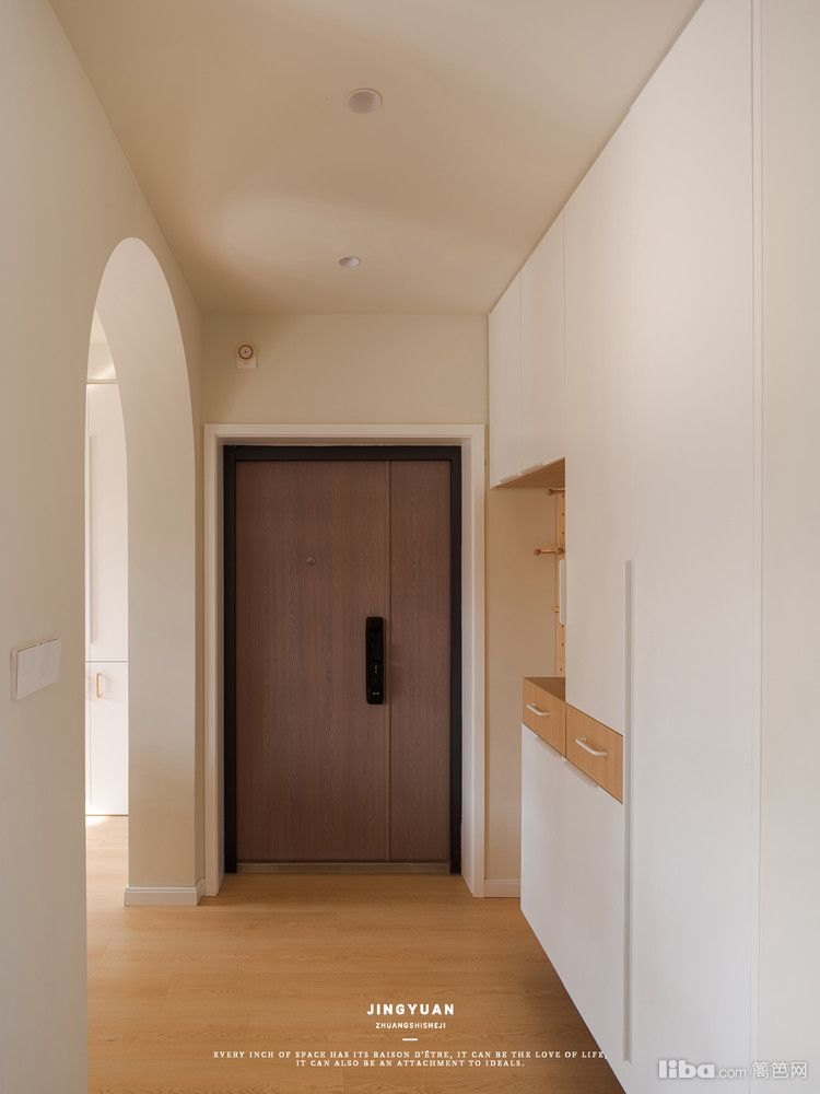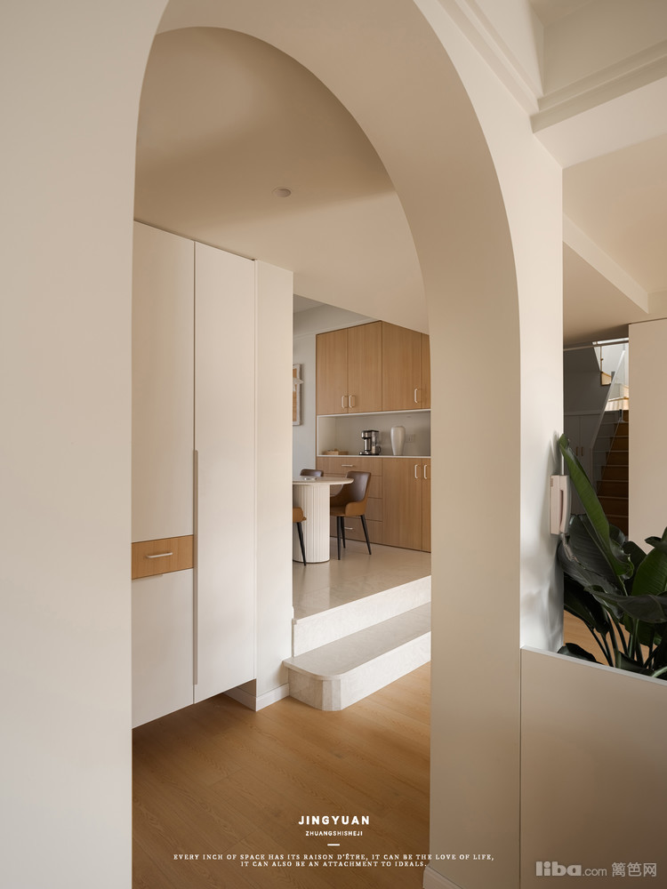 圆弧形的智能镜子与拱门、餐桌等相呼应,侧边的立柜,下方的抽屉等都可以储物;