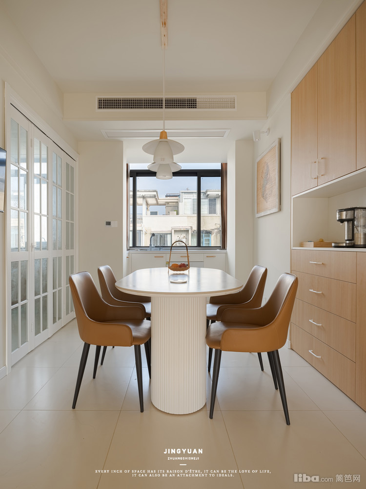 岩板餐桌色调淡雅温柔,可以耐高温、耐刮摸,容易打扫,与棕色皮质餐椅相辅相成。