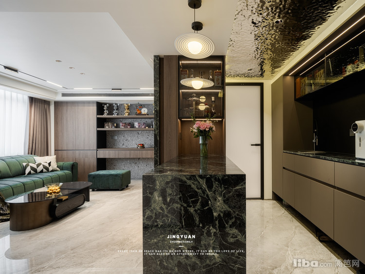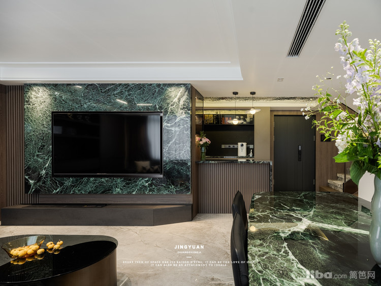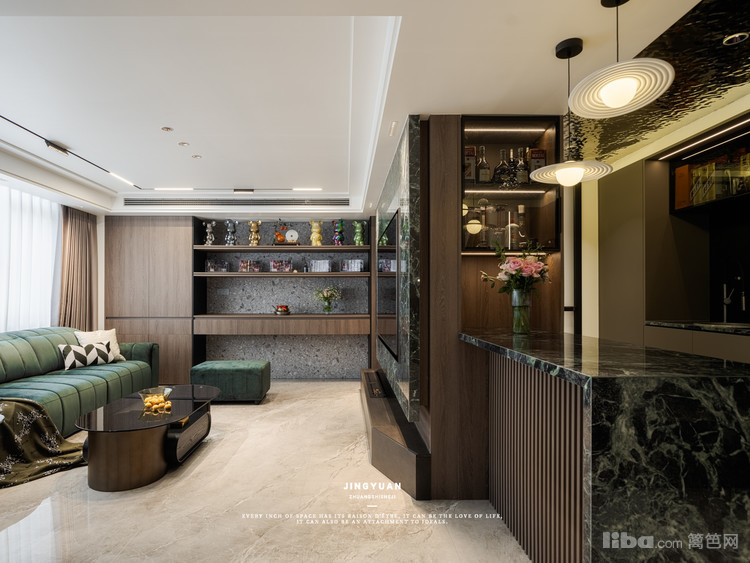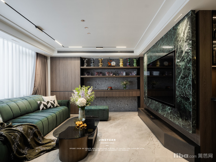 石材与木饰面的结合,普拉达绿作为主背景,加强独特空间感,满墙的展示柜+储物柜让客厅不再琐碎,同色系的沙发与之形成了色彩呼应,空间里充满了宁静自然的高级感
