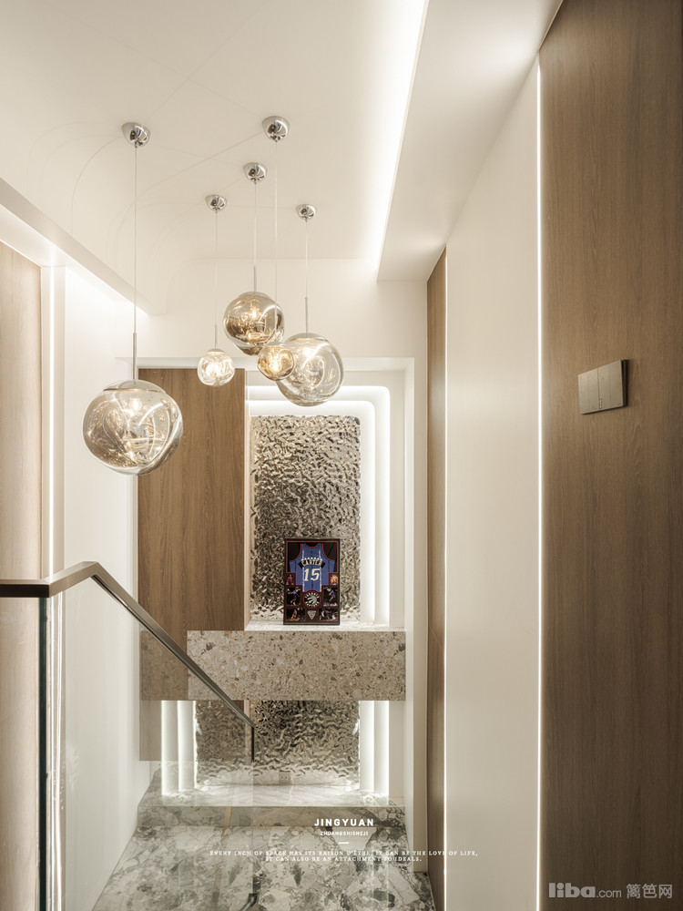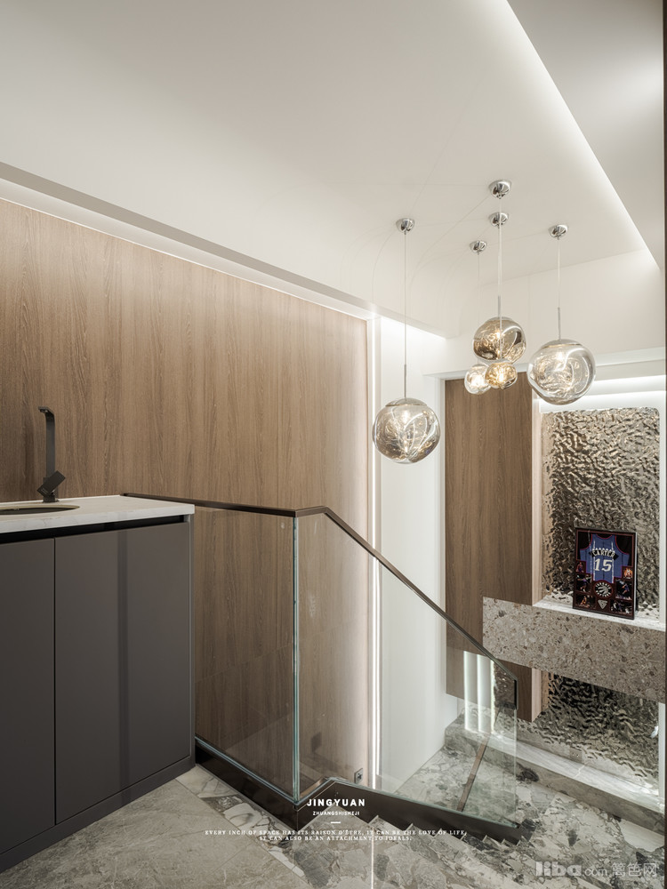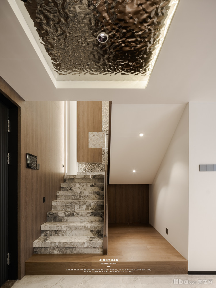 金属、石材岩板与木质护墙板的碰撞,挑空的高度让整个空间更加延展通透