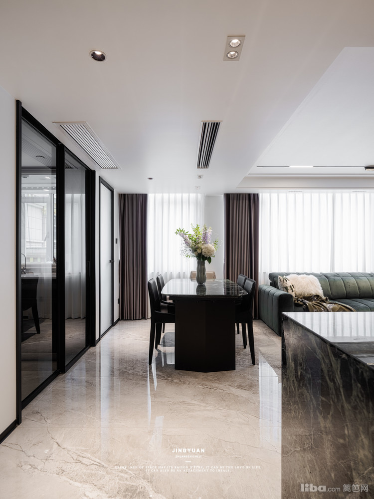 餐桌的大理石来自电视背景墙的中空部分,取自一体,用于同一空间,普拉达绿大理石作为点缀,应用于客厅、吧台和餐桌区域,给原本有些平淡的空间里,增加了极强的视觉张力