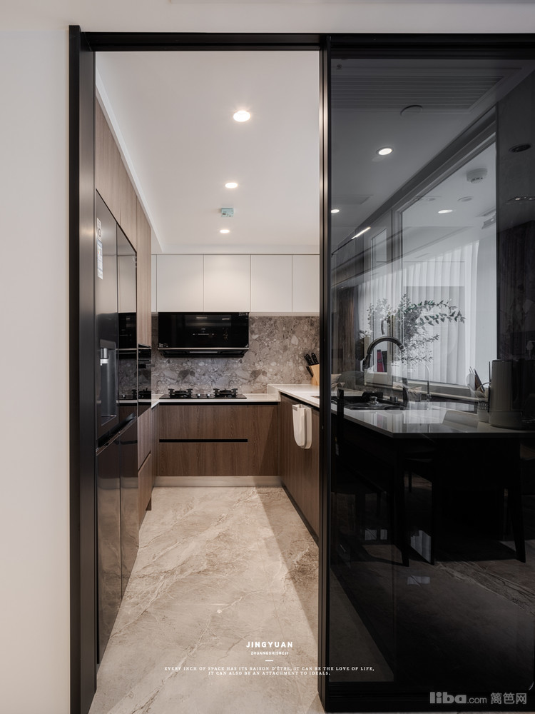 厨房外扩后分为:厨房+晾晒阳台,木质搭配岩板形成视觉上的层次感,U型结构最大化利用空间,橱柜无把手设计,吊柜地柜加嵌入式家电,根据空间大小进行相应的布局,力争将空间利用率最大化