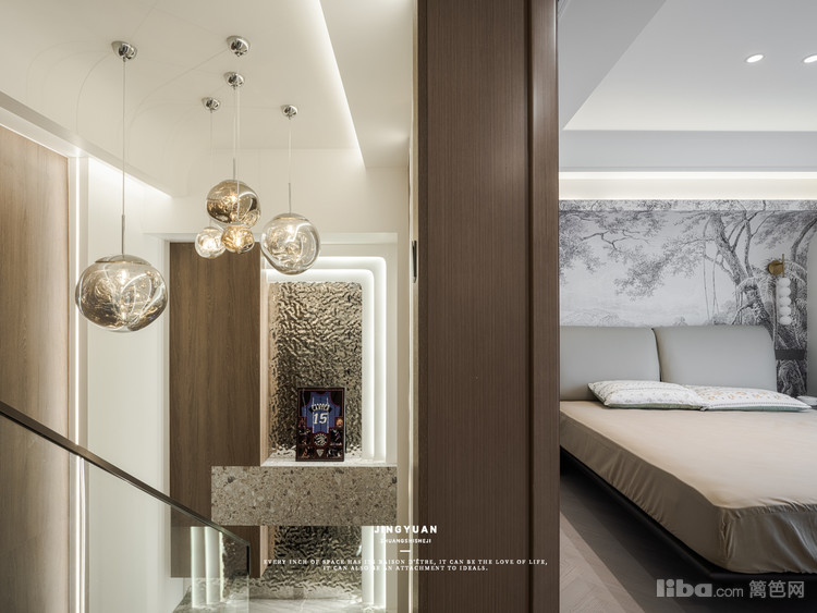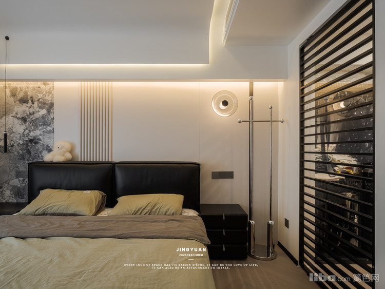 主卧木饰面和大理石岩板的搭配显得格外有腔调,无主灯设计结合床头艺术壁灯,低调而不失优雅,整体家居色彩选用深色系搭配木地板,营造出空间的节奏感和比例之美,