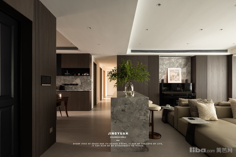 客厅整体空间用暖咖色来搭配,运用木饰面、岩板、奢石等不同材质的碰撞,整体空间精致感十足,岩板墙面与木饰面竖纹格栅搭配组合,形成视觉上的层次感,不同材质作区分,空间层级更加丰富。