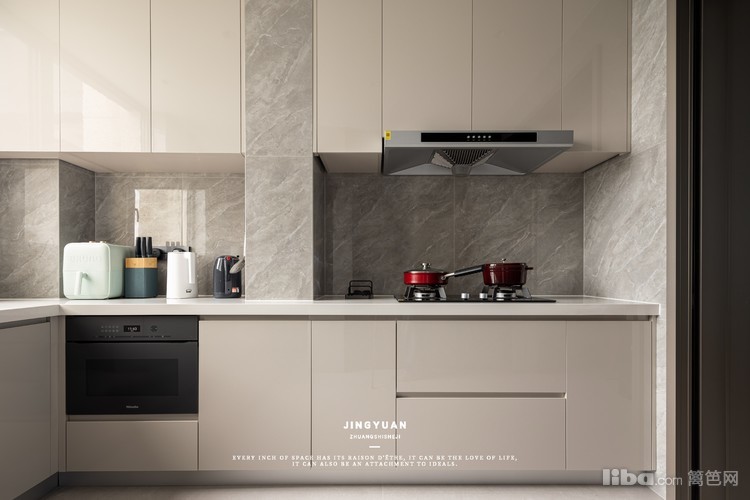 厨房的整体采用深咖、淡奶、浅灰的色调,采用U型结构,最大化的利用空间,增添收纳;橱柜无把手设计,嵌入式家电等让空间更整洁,根据空间大小进行相应的布局,将空间最大化利用。