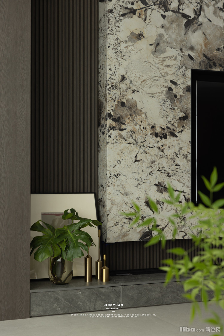 电视墙背景整体用木格栅和奢石做拼接,增加整体的层次感,使整体墙面看上去更有艺术性