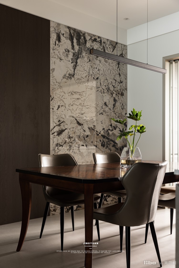 餐厅做开放式设计的处理,增加用餐的空间感,大理石岩板搭配实木餐桌、棕色的皮质餐椅,昏黄的灯光又给整个空间带来氛围感。