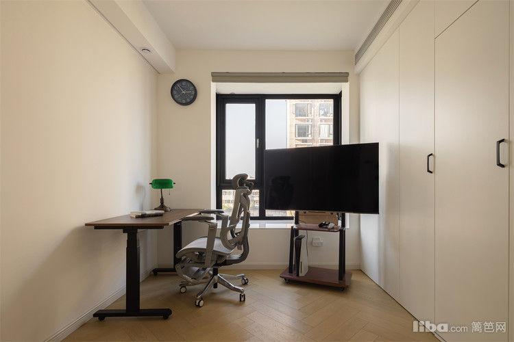 次卧打造集办公、客卧、影音、储物功能为一体的多功能房,浅色硬装搭配深色软装。