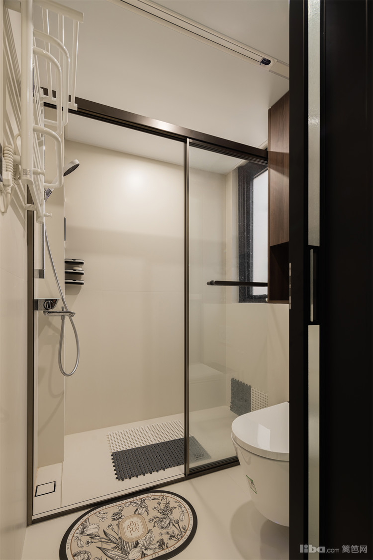 干湿区同样遵循深浅色搭配,木材与石材搭配使用顺应面积整合,