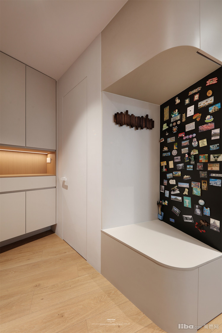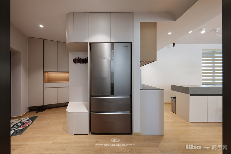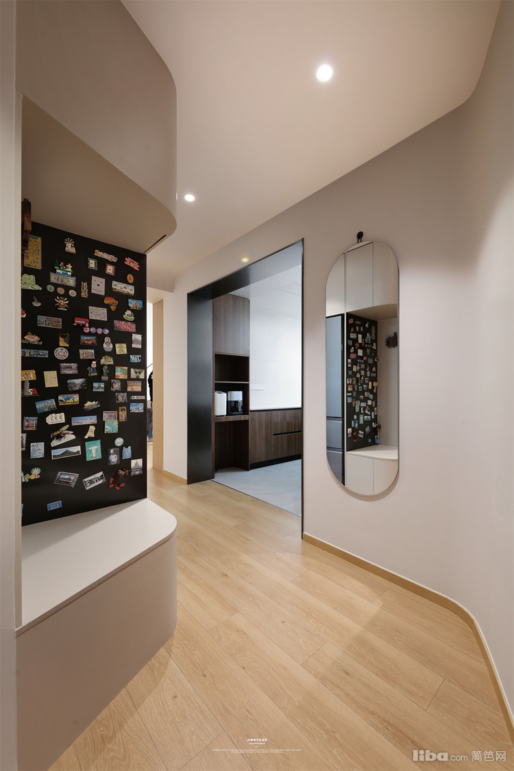 玄关到厨房区域属于斜角异形。利用异形空间,设计T字型墙体划分餐厅和玄关储物间区域,打造餐边柜和进门收纳,同时满足两个空间的功能需求,还拥有多功能的进门玄关。