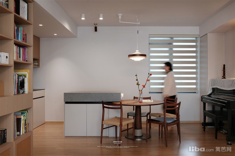 摒弃传统客厅设计,采用整面书柜代替电视墙,让客厅成为一个共享图书馆式的阅读空间。