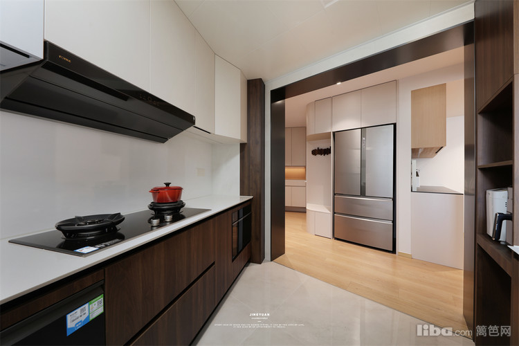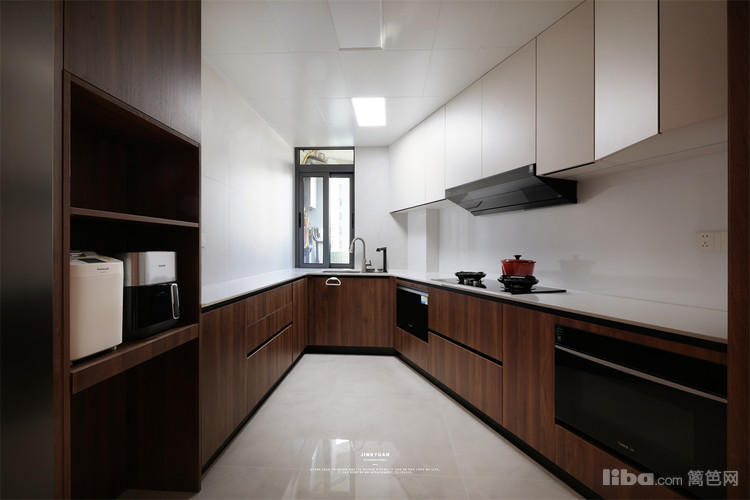 由推拉门进入烟火气的中式厨房,V形布局,以清洗区为中界分隔台面,烹炒区与备菜区分明。