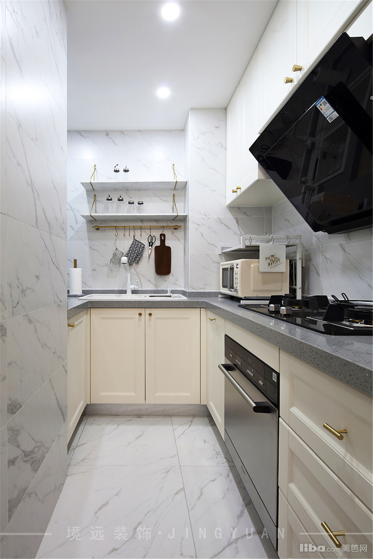 厨房也过于狭长,人在操作的过程中舒适度和利用率都不高。因此把厨房过道压缩至只剩台面的空间,形成U型台面,确保留有足够的操作台面。