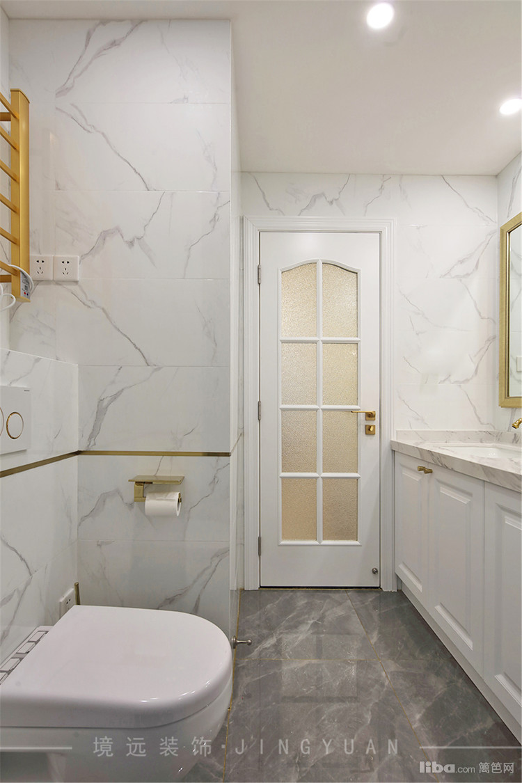 卫生间墙面采用爵士白,用金属线条加以点缀,再配上金色的镜框龙头,花洒。增加了卫生间的高级感。