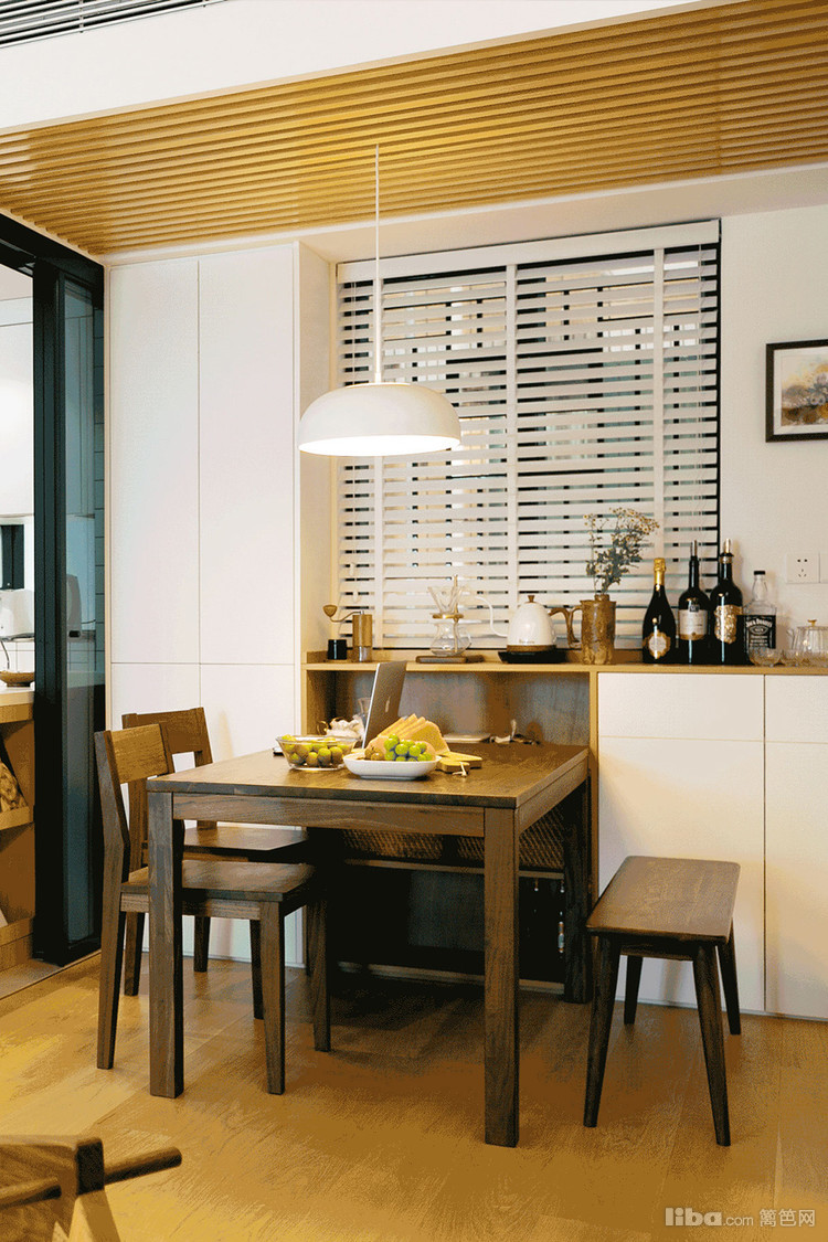 木色与白色的搭配,简约而温馨。分柜体中间镂空部分,连接窗边的木质台面,井然有序地摆着红酒、茶具、水壶、绿植等用品。