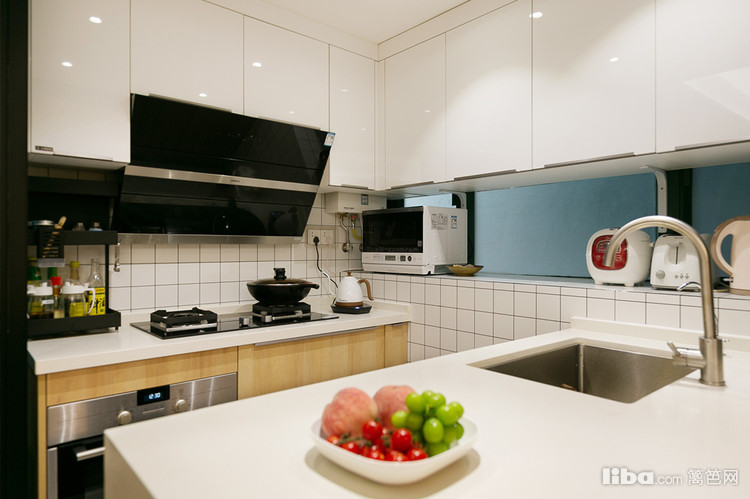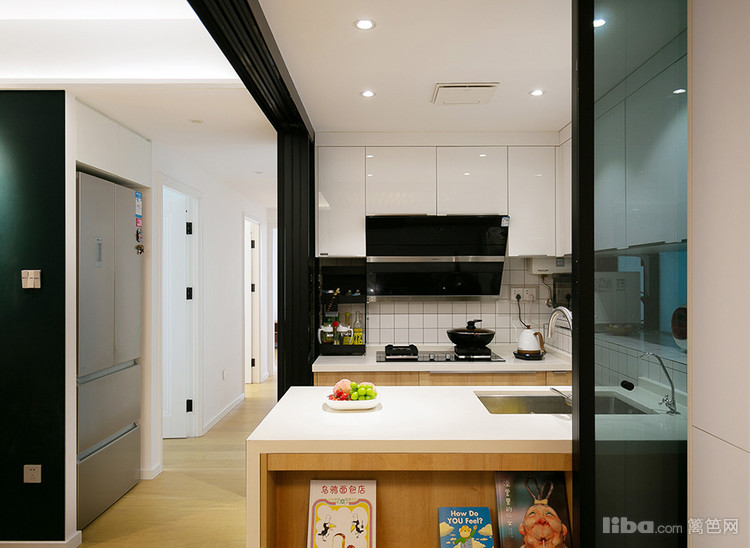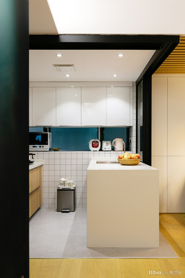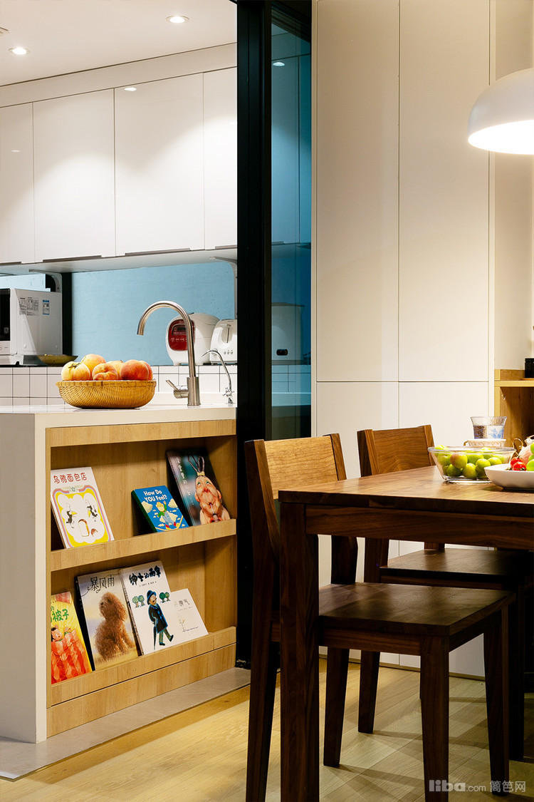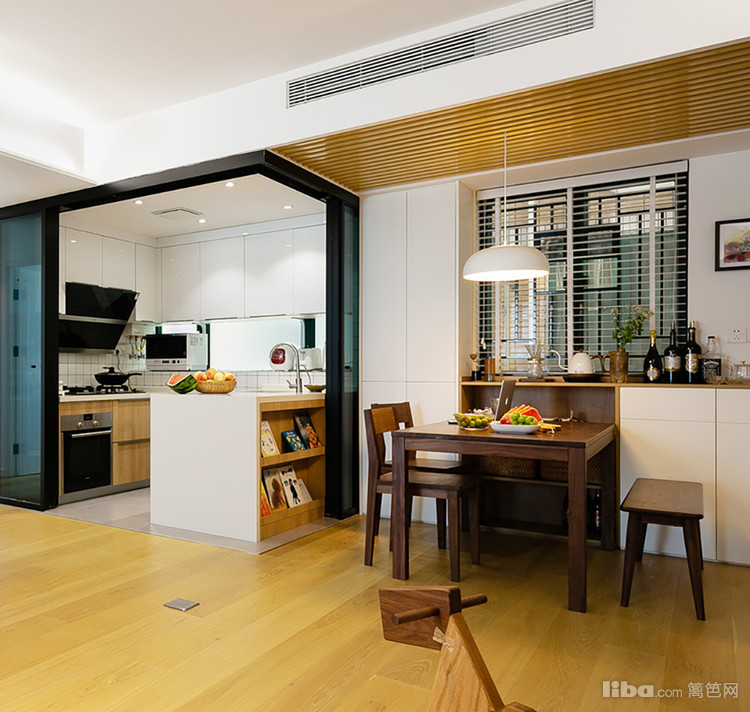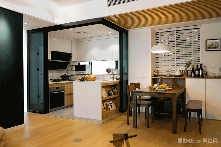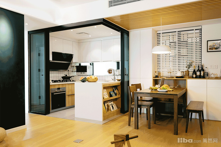原先的厨房为封闭设计,这里设计师打通了厨房空间, 用对角推拉门做成开合式。这样一来,不但增强了厨房、餐厅、客厅三个空间的交互性,也使得整个布局更加鲜活通透。
