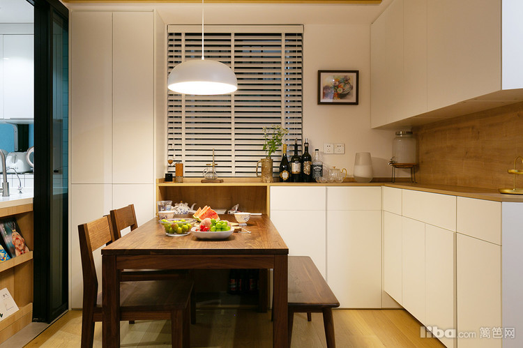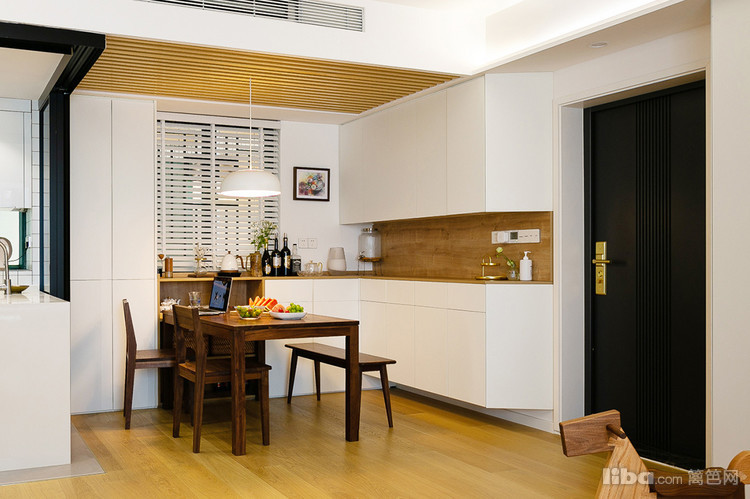 图中我们也可以看出,白色与木色的搭配呼应了餐厅空间,而极致的收纳,也在厨房中得到了充分的体现。