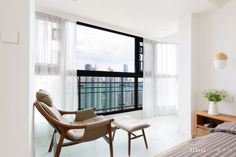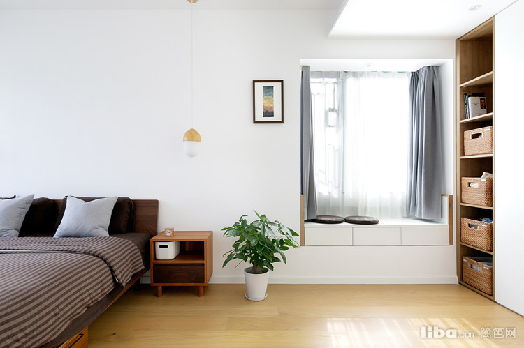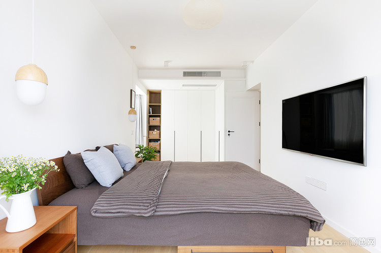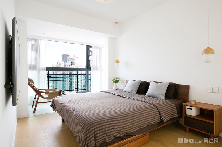 主卧的空间比较宽敞,但目前的布局比较简约。纯白主色配搭木质底色,打造得卧室空间温润又舒适,咖色的条纹床品在线条的纹理下彰显细腻质感。