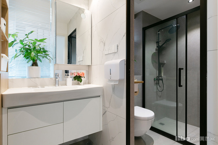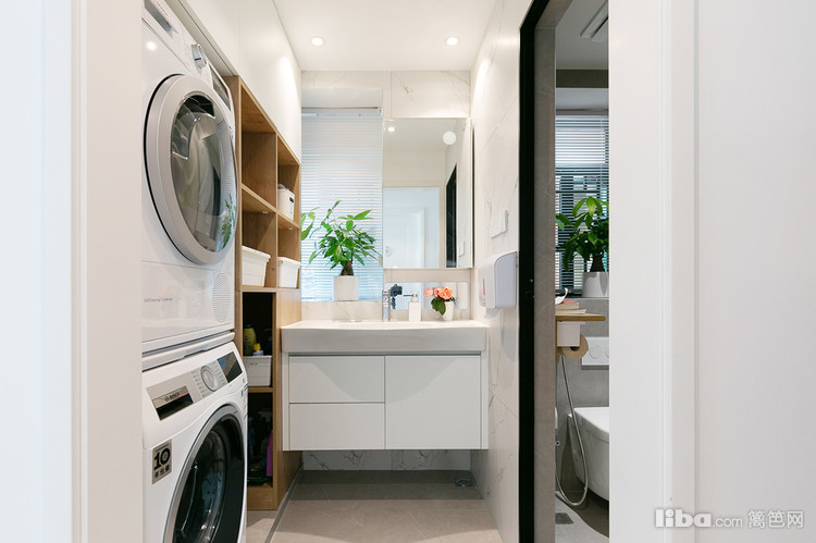 洗漱台外移打造干区,与洗衣机、烘干机、收纳柜的完美结合,动线流畅,更是家里幸福指数提升的一大关键。