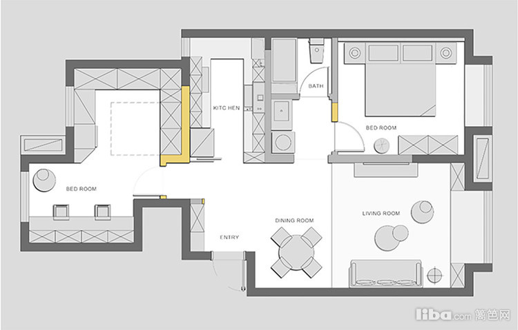 两个房间打通后,进门区域设立整墙大柜子用来收纳,墙体内藏入折叠床,收起来就是普通柜子,放下后直接变成一个次卧,父母朋友来不用担心没地睡