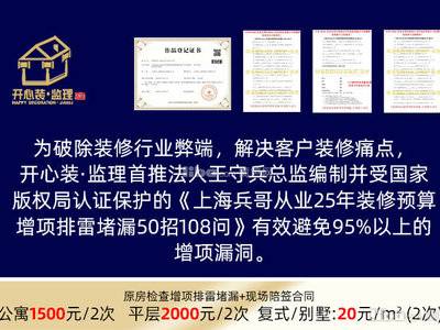 开心装·监理于2002年7月8日成立,公司拥有住建部监理资质首推总监王守兵编制并受国家版权局认证保护的增项排雷堵漏108问杜绝恶意增项漏项,装修质量安全成本进度全过程监督管理。