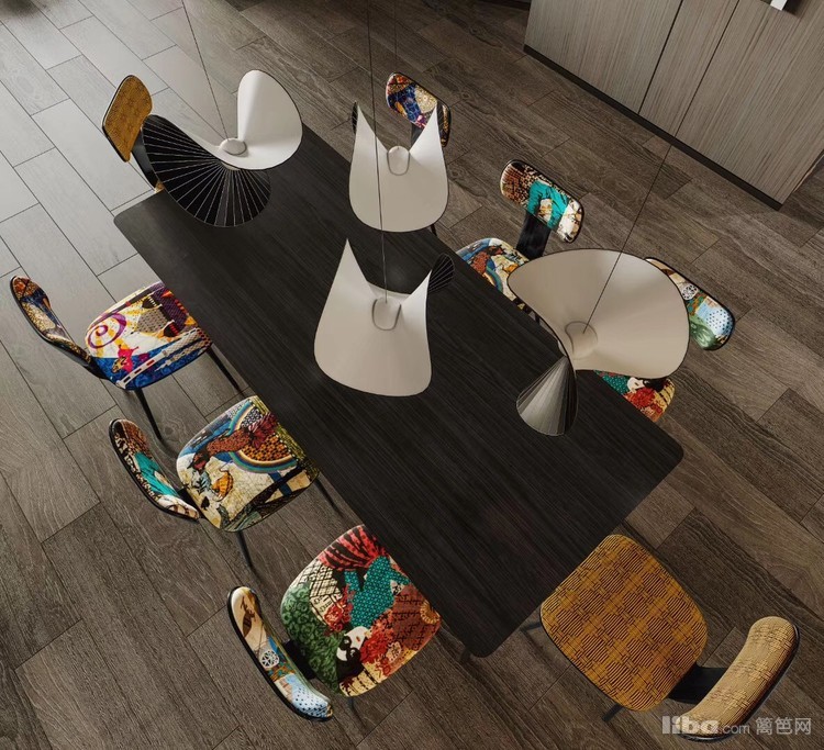 餐厅采用几张色彩鲜明的餐椅就撞出了一个俏皮的空间氛围,餐椅的靠背边和椅子腿是常见的现代黑色,与餐桌前后呼应更具有线条感.