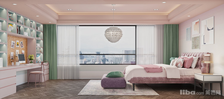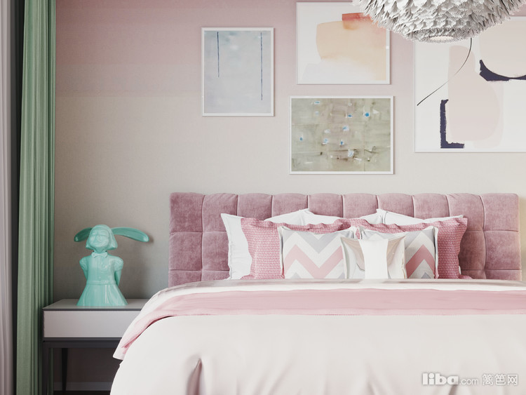 卧室又是另外一番风景,柔和的薄荷绿与大面积的淡粉色柔和的包裹着卧室,营造着甜美的公主梦.