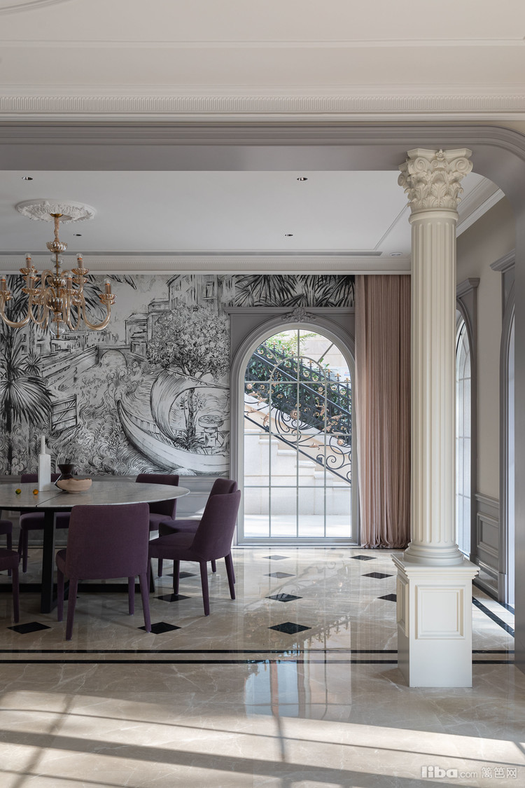经典廊柱 雕花 石膏线框等元素 搭配黑白单色艺术壁纸