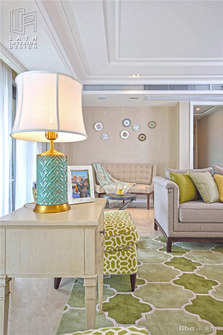 地毯绿色的软绒质感和茶几白色的瓷釉光泽,形成鲜明的对比,带来清爽干净的感觉。阳光透过两扇大大的落地窗洒进客厅.....没有什么比此时触手可及的鲜活幸福,更令人感到愉悦了。