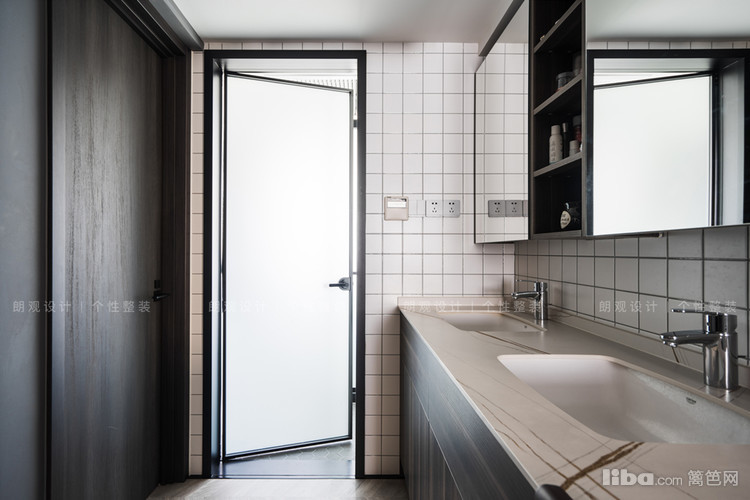 一楼的卫生间日常使用频率高,设计师进行干湿分离设计。干区采用了双台盆和镜面柜的结合,增加使用效率。