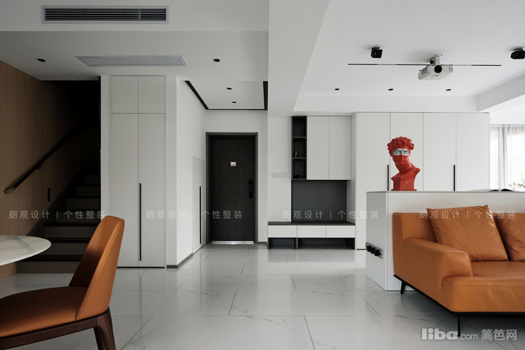 将空间打通后定制白色玄关柜,集换鞋凳与储物为一体,解决了主人进出门时换鞋,悬挂衣物等需求。