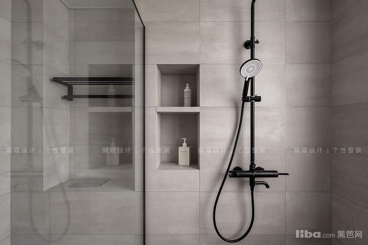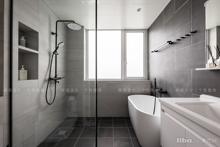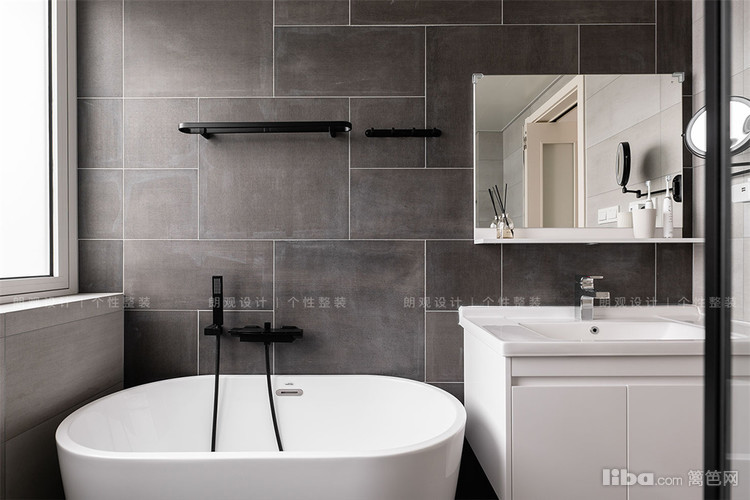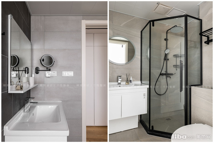 主卫设计干爽利落,墙面采用深浅两种不同灰度的瓷砖拼接,将大块瓷砖自行切割后再拼接,很好地避免空间死板。