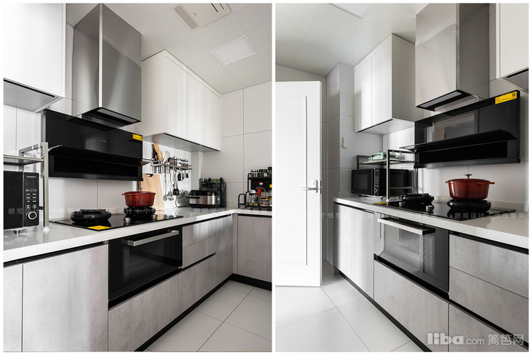 厨房面积小,设计以合理利用空间为首任,整体设计充分利用墙面的纵向空间,吊柜、储物架等各种利器,搭配部分家电的嵌入设计,让小空间井井有序。