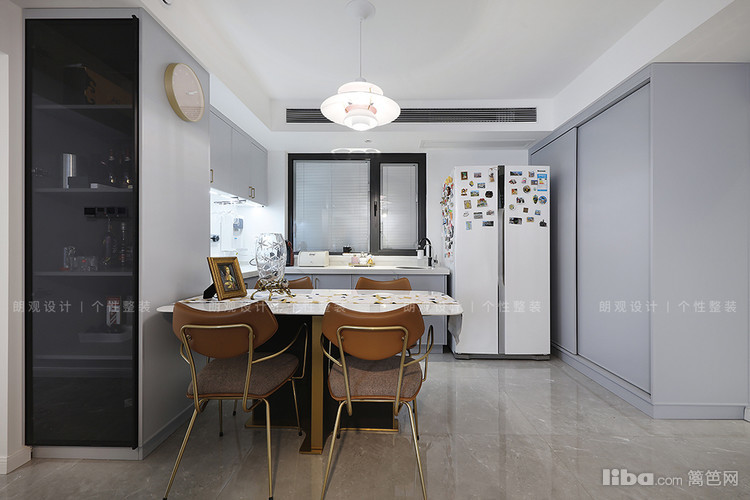 原餐厅区域增设了西厨,弥补中厨操作空间不足的问题,实现双厨配置。西厨橱柜与酒柜衔接,利用L动线,充分扩充餐厅的存储空间。