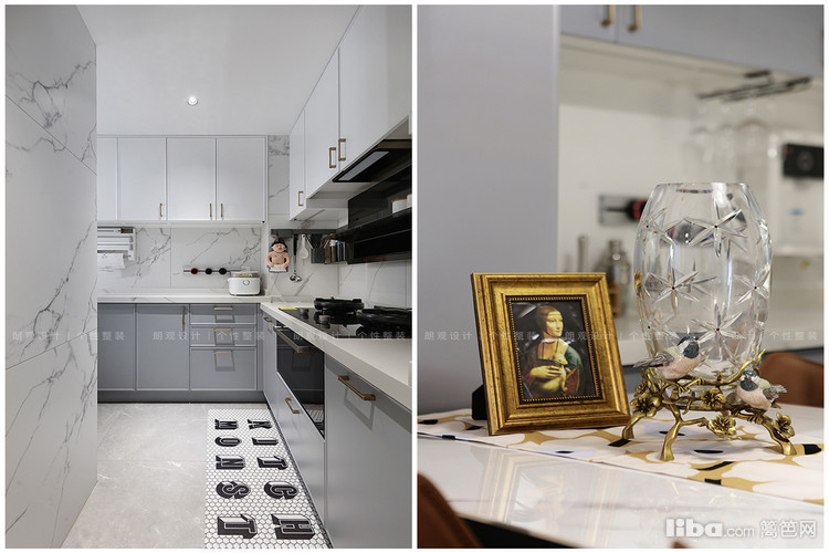 在布局上依照厨房自身的L型格局,合理分配洗切烹功能区,并采用上下分体式橱柜增加收纳空间,保障厨房干净不凌乱。