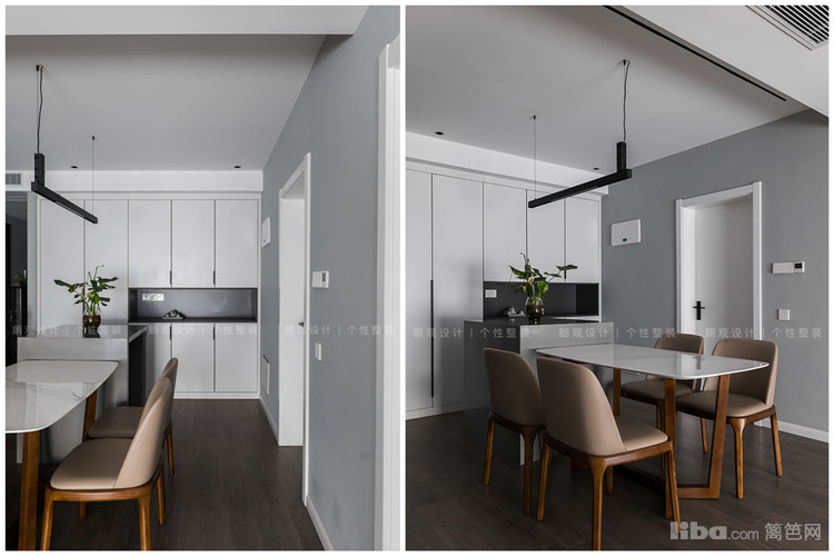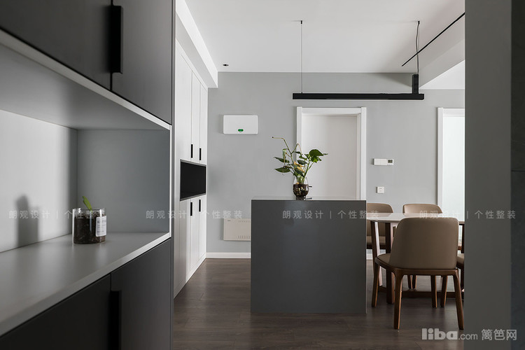 餐厅定制方形岛台增加操作面,与餐桌的高低差以及延伸设计,形成强烈的几何符号,有效加强了空间的艺术感。