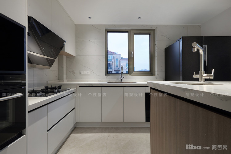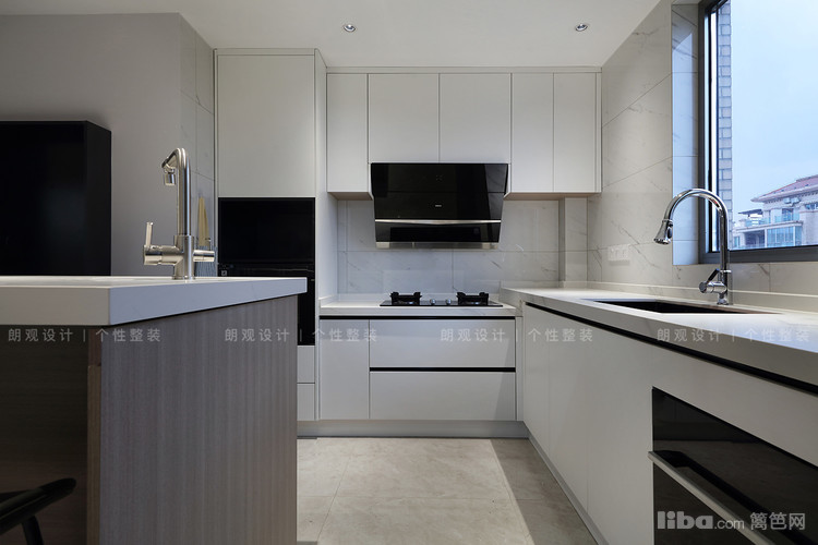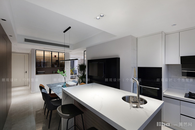 中厨区域L型动线合理分配功能区,与中岛餐桌形成洄游动线,弥补厨房狭小和操作台面不足。