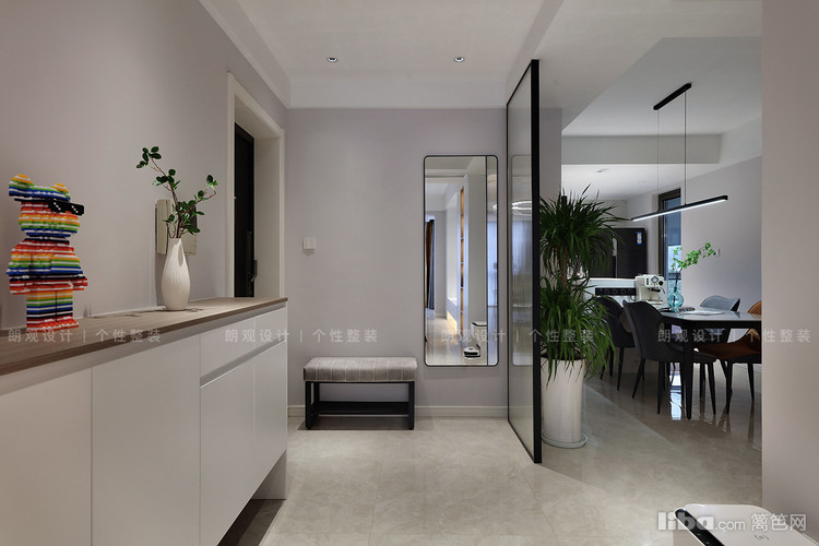 利用浅灰色和白色营造高级简约的质感,又有雅致空灵的情调。转角定制到顶柜体用以收纳鞋帽、外套等,缓解玄关储物不足的问题。