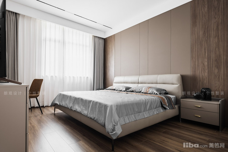 主卧背景以硬包和木纹护墙板做拼接,淡淡香槟色营造出浪漫静谧的氛围感。