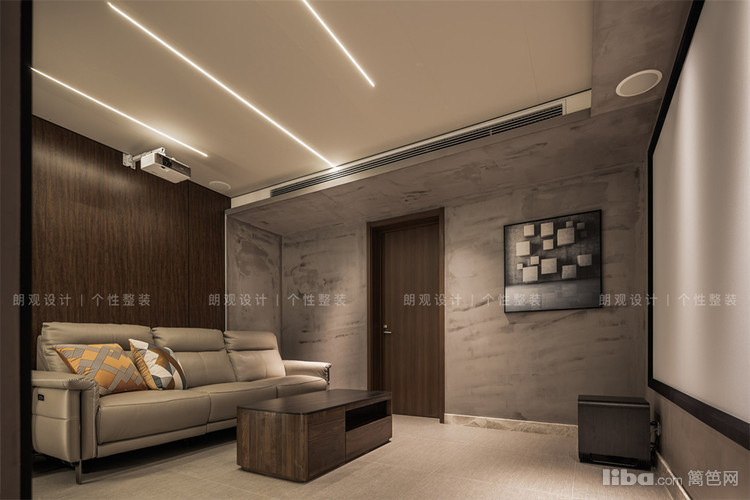 嵌入式灯带从墙面延伸至顶部,木纹饰面和微水泥特殊纹路的融入,营造出一种现代感和科技感结合的炫酷视觉。